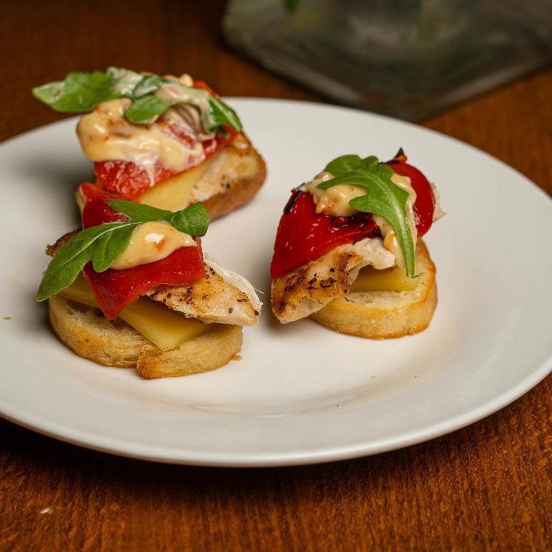 Seared chicken breast, garlic aioli, roasted red pepper, sundried tomato compote, arugula served on a toasted baguette | 12 per tray.