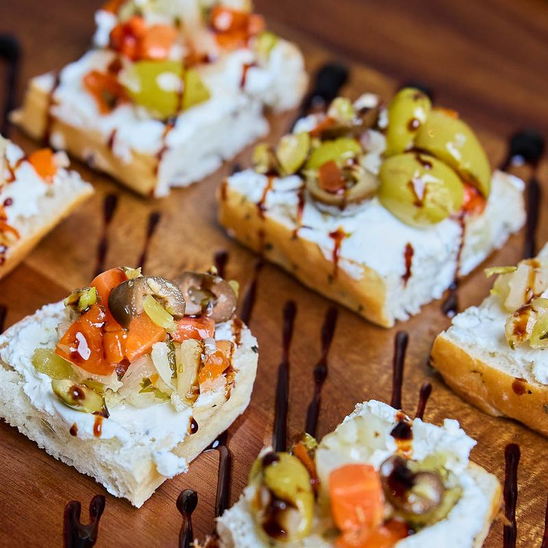 Savory ricotta, lemon, tomato, basil mixture, on toast | 12 per tray.