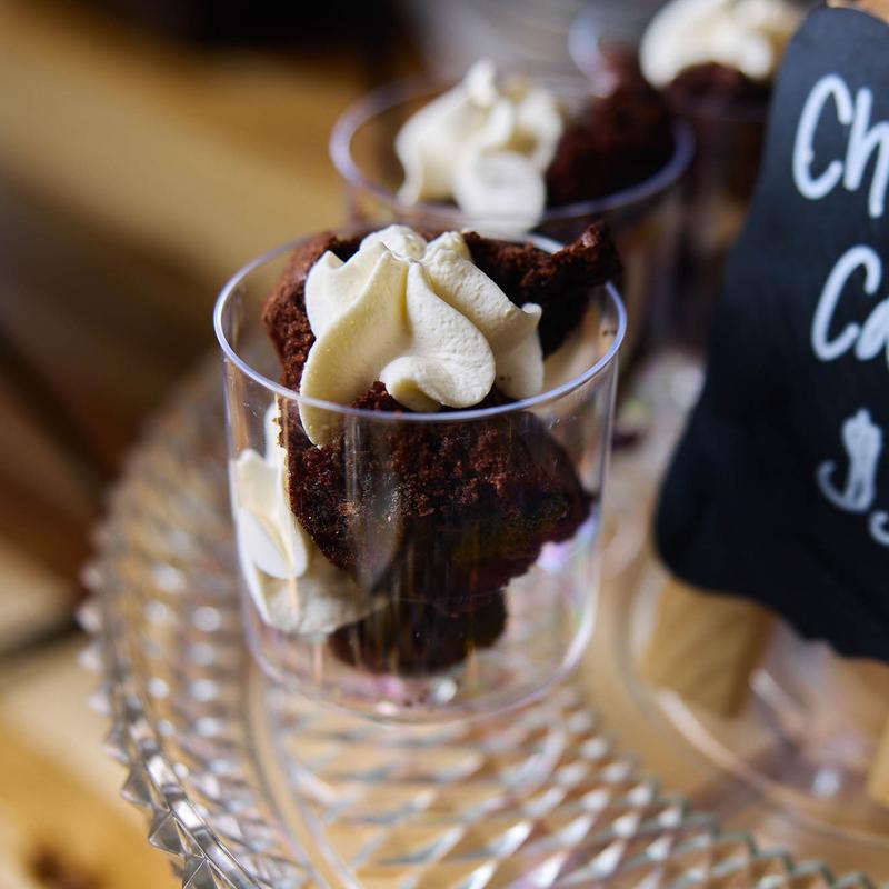 Chocolate mousse with raspberry puree served in stemmed shooter.