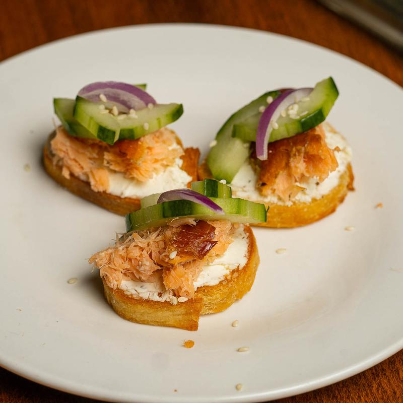 Smoked salmon, over garlic dill cream cheese, topped with cucumber, and green onions on a toasted baguette | 12 per tray.