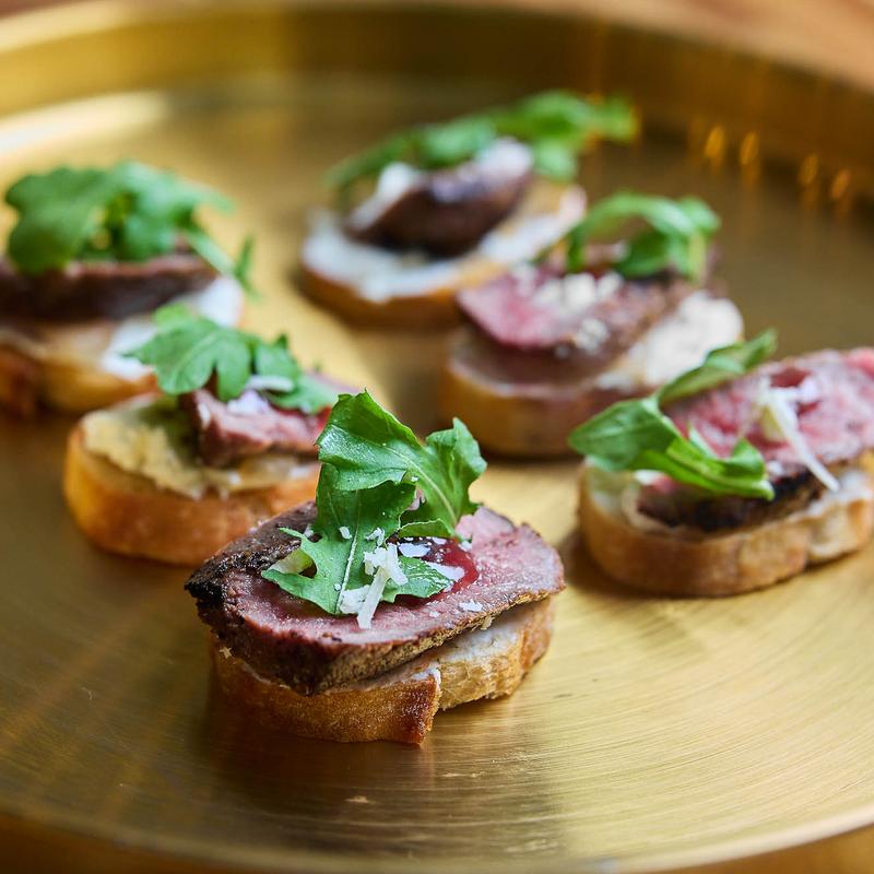 Marinaded grass-fed beef, topped with caramelized onions, gorgonzola cheese, and sweet balsamic glaze on a toasted baguette | 12 per tray.