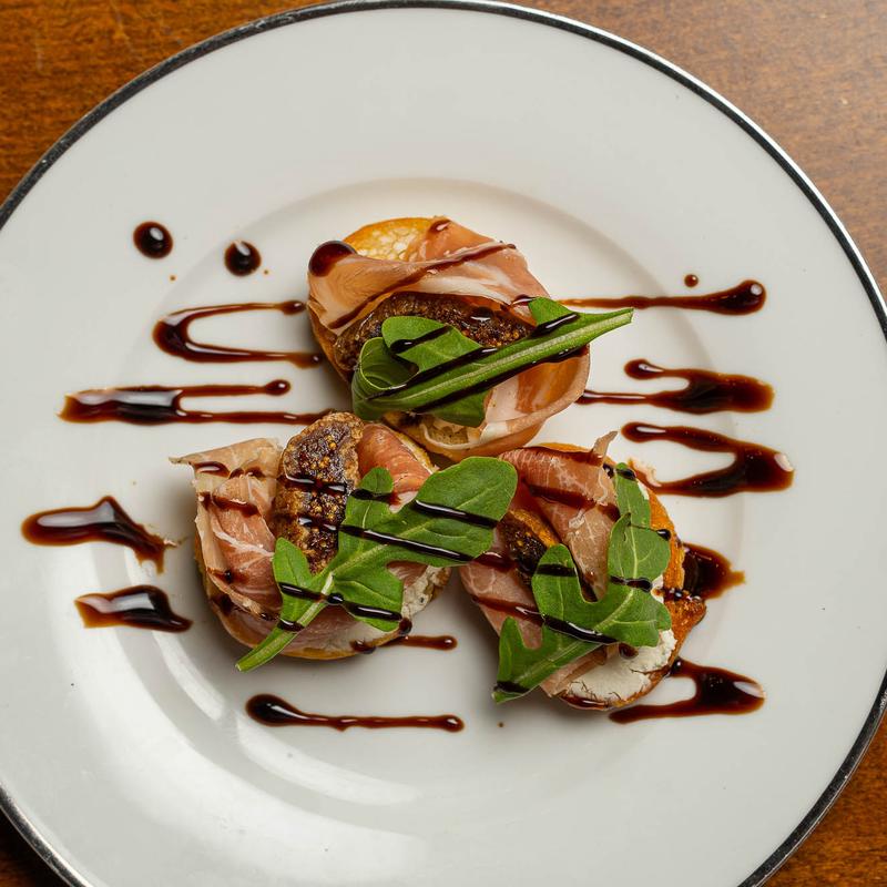 Creamy whipped cheese, prosciutto, fig, and arugula on toasted crostini | 12 per tray.