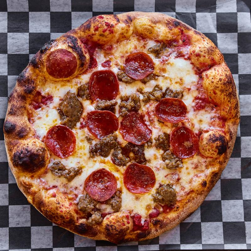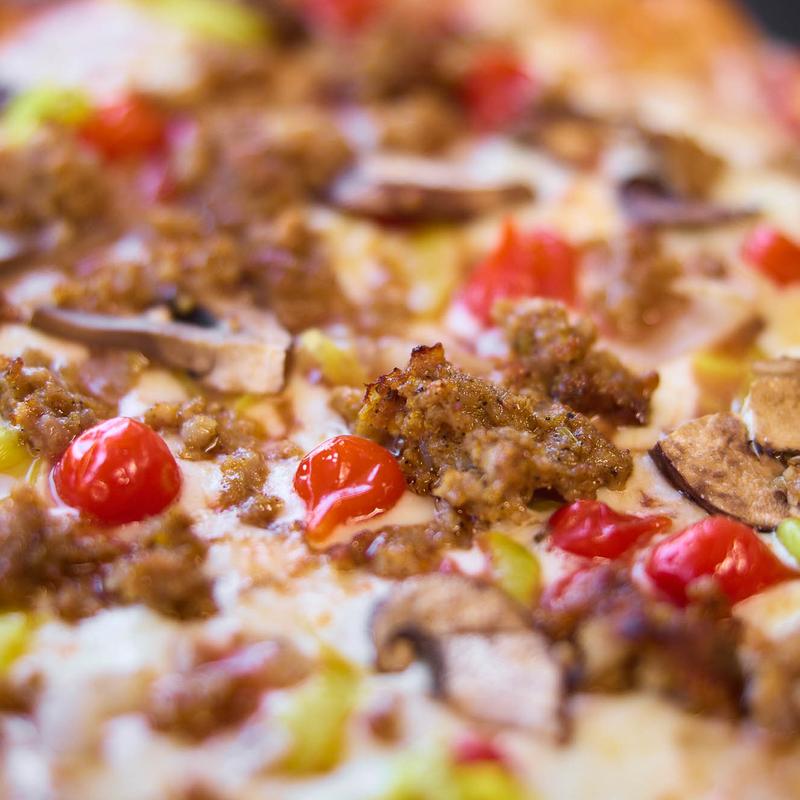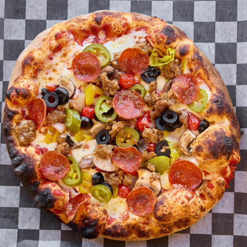 Spicy Italian sausage, pepperoni, caramelized balsamic onions, pepperoncini peppers, mushrooms, black olives, amazing sweety drop peppers, and jalapeños.