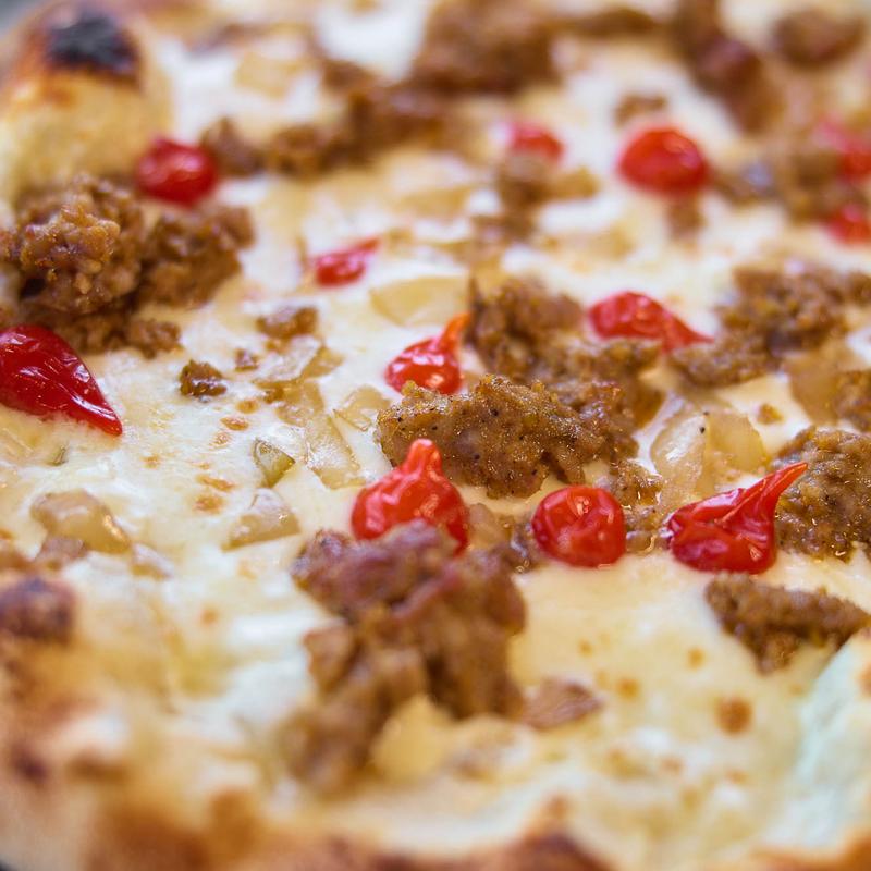 Creamy seasoned ricotta cheese, topped with Italian sausage, caramelized balsamic onions, sweety drop peppers, drizzled with local honey.